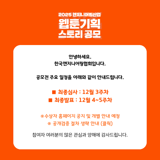- 수상작이 향후 사업화(웹툰 제작, 드라마 제작 등)될 경우, 작품 내 주요 크레딧 및 홍보물에 한국엔지니어링협회 웹툰 기획 스토리 공모 수상작 문구와 협회 로고 표기를 권장함